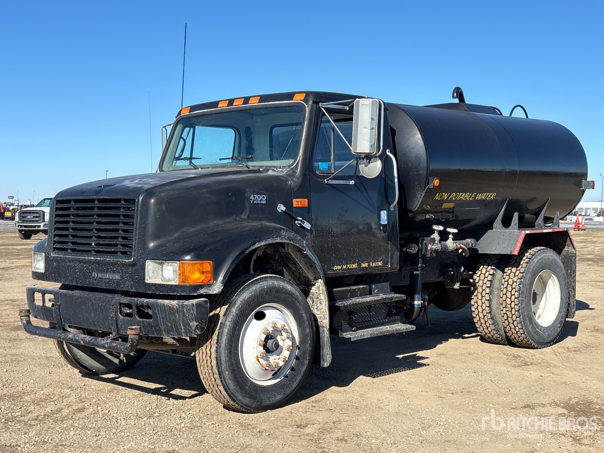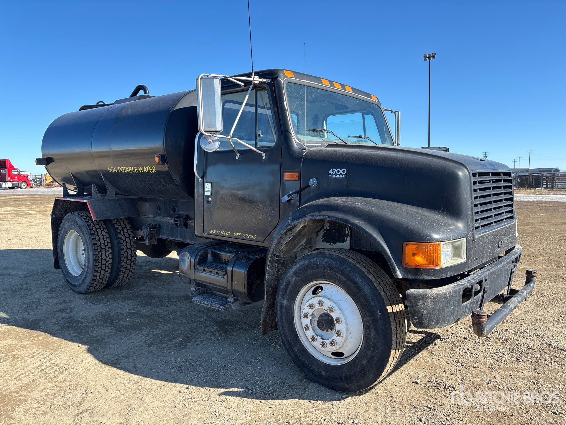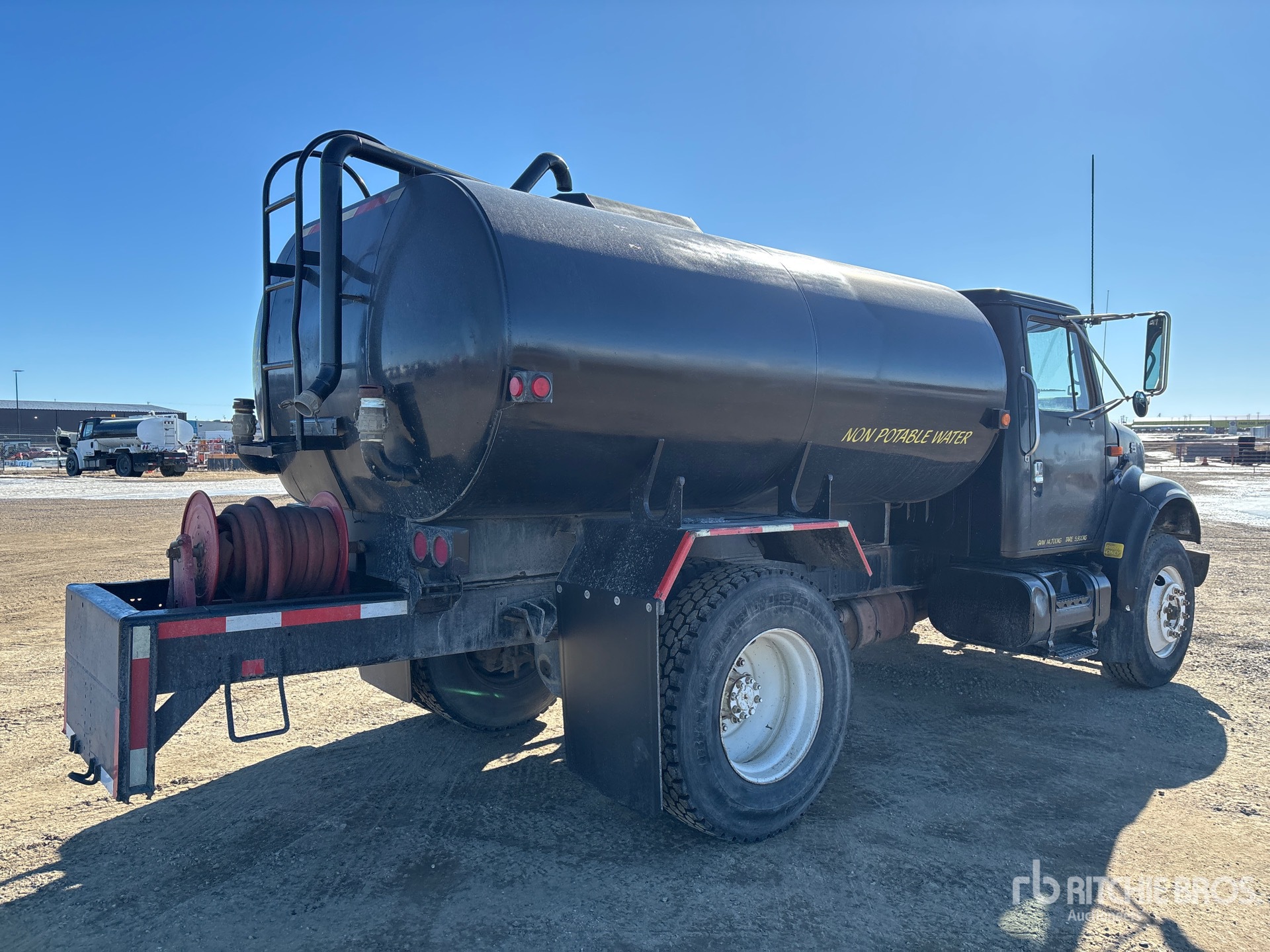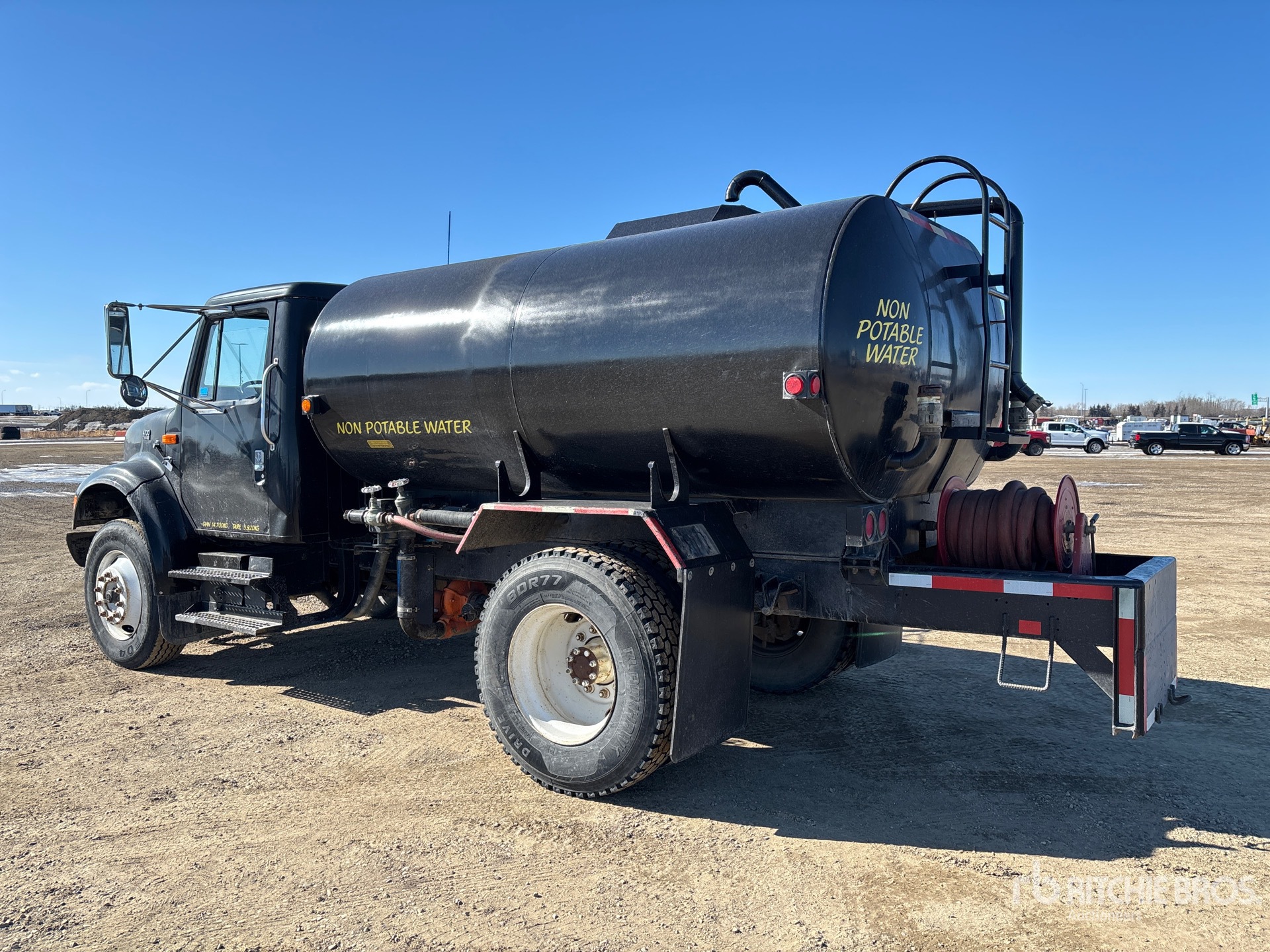 International T444E V8 7.3 L Diesel 190 hp Engine, 1999 US EPA Label, CARB Compliant, International 6Plus 6-Speed Manual Transmission, 10008 lb Front Axle, 17515 lb Rears, 27524 lb GVWR, 295/75R22.5 Front Tires, 11R22.5 Rear Tires, Spring Suspension, 152 in Wheelbase, PTO, Steel Tank, Berkeley PTO Driven Pump, 5 ft 3 in, Spray Bar, Hose Reel, Front Spray, Rear Spray, Side Spray, In Cab Controls
