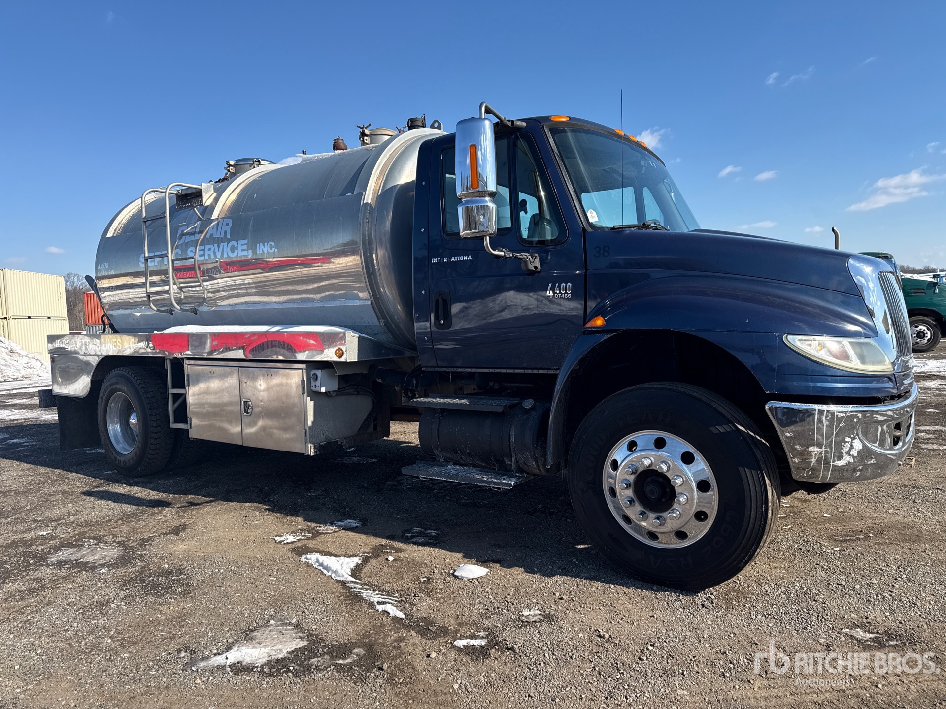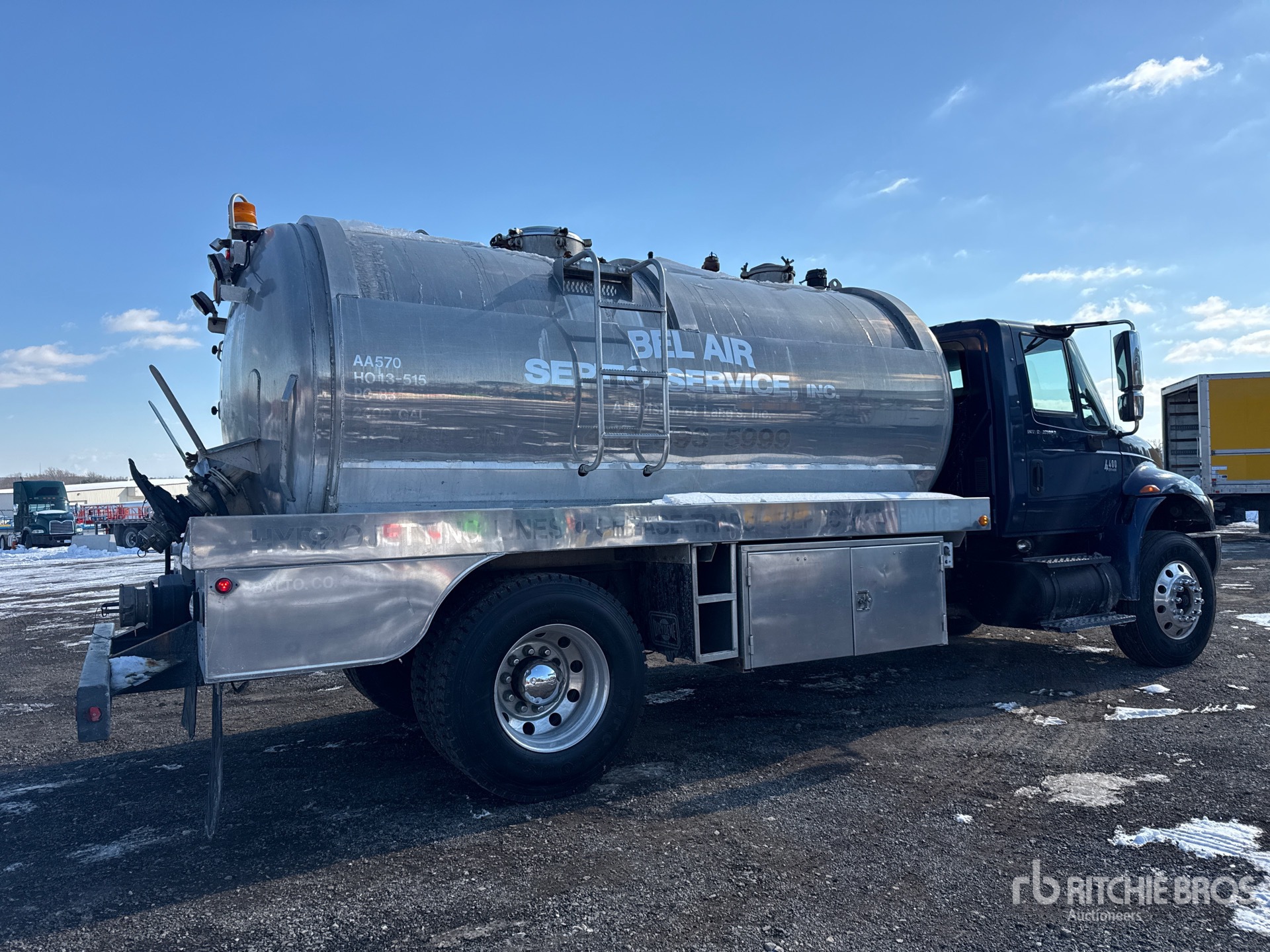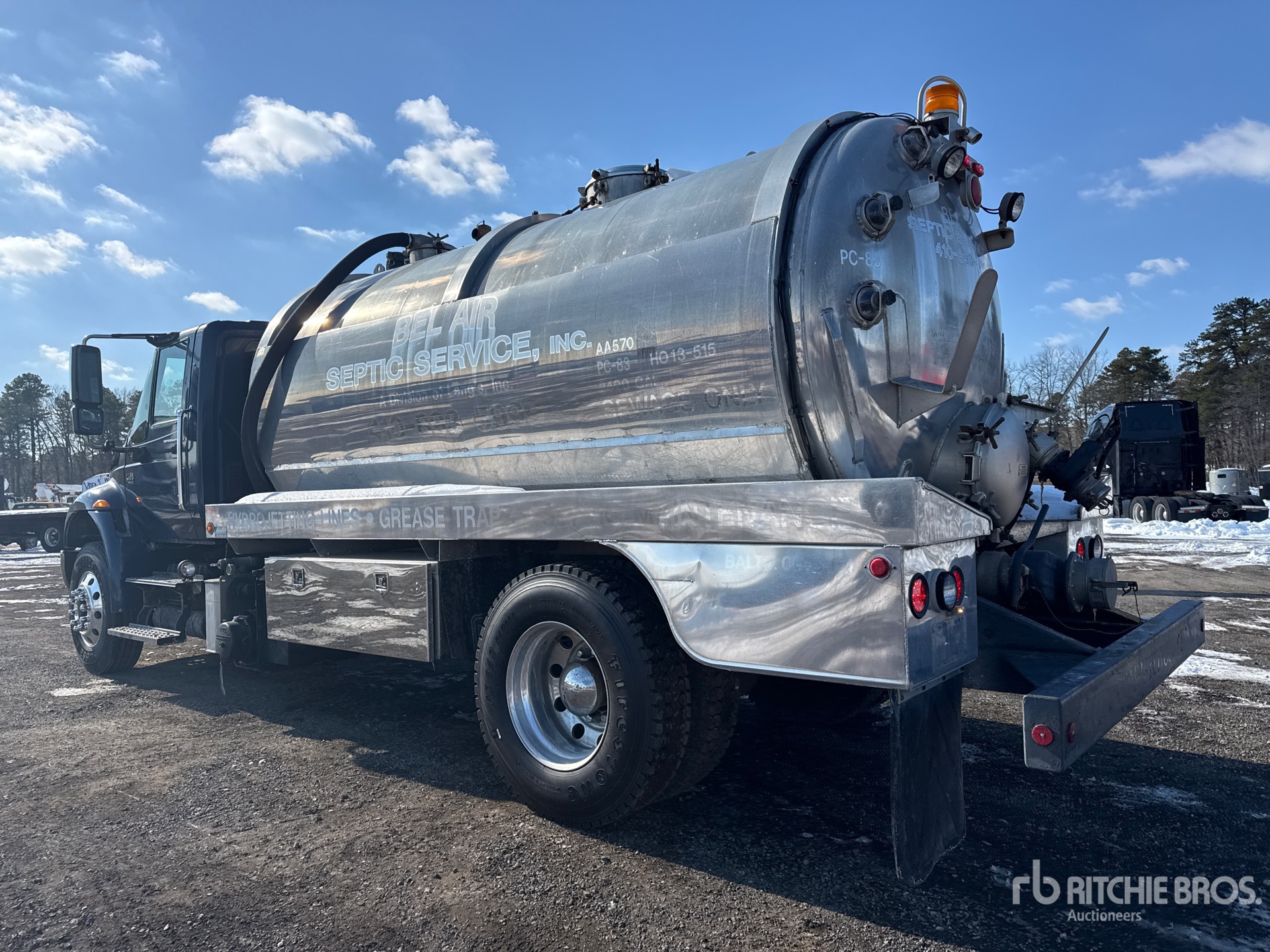 International 6 Cylinder Diesel Engine, 8597 Engine hrs, Exhaust Brake, 5-Speed Automatic Transmission, Differential Lock, 12000 lb Front Axle, 21000 lb Rears, 33000 lb GVWR, Aluminum Wheels, 11R22.5 Front Tires, 11R22.5 Rear Tires, Spring Suspension, 205 in Wheelbase, PTO, Aluminum 2800 gal Debris Tank, Manual Tailgate Locks, National Vacuum PTO Driven Pump