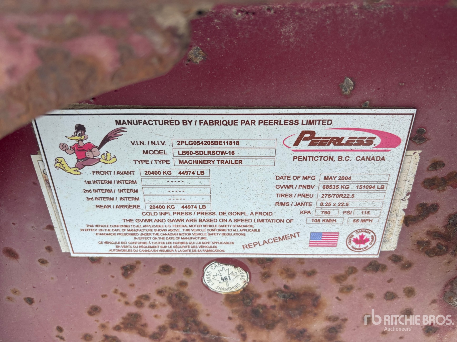 The detailed equipment information is limited in scope, and Ritchie Bros. Auctioneers has not inspected any aspects or components of the equipment other than those expressly set forth herein. Unless expressly stated, we make no representations or warranties, express or implied, concerning the equipment or its components, including without limitation any representations or warranties concerning functionality, conformity or compliance with any safety standard or requirement of any applicable authority or regulatory body, fitness for any particular purpose, or merchantability. You are strongly advised to perform your own detailed inspection of the equipment prior to bidding.