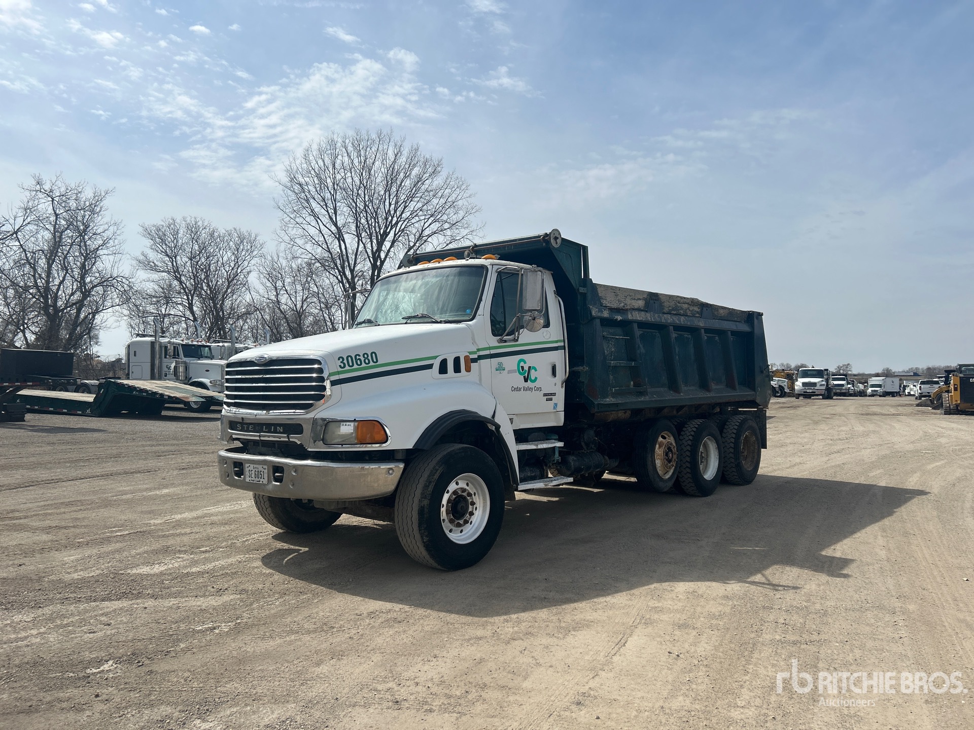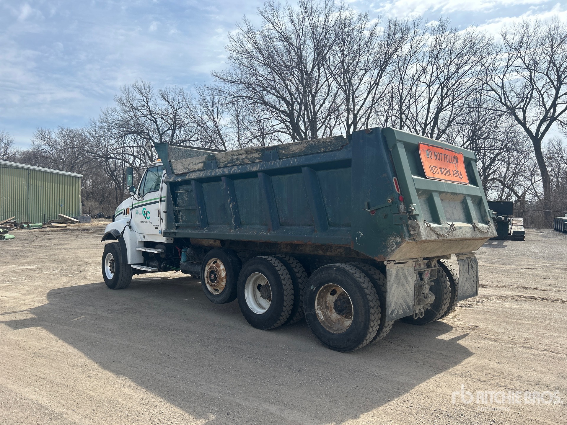 Mercedes-Benz MBE4000 6 Cylinder 12.8 L Diesel 350 hp Engine, 2005 US EPA Label, 16823 Engine hrs, Engine Brake, Eaton Fuller RTO-14908LL 8LL Manual Transmission, 18000 lb Front Axle, Meritor RT-40-145 Drive Axles, 4.33:1 Axle Ratio, Air Ride Cab, Aluminum Front Wheels, 385/65R22.5 Front Tires, 11R22.5 Rear Tires, Steerable Air Lift Pusher Axle, Steerable Air Lift Tag Axle, Rubber over Walking Beam Suspension, 220 in Wheelbase, PTO, 16 ft Long x 4 ft High Steel Body, Rear Hydraulics, Pintle Hitch