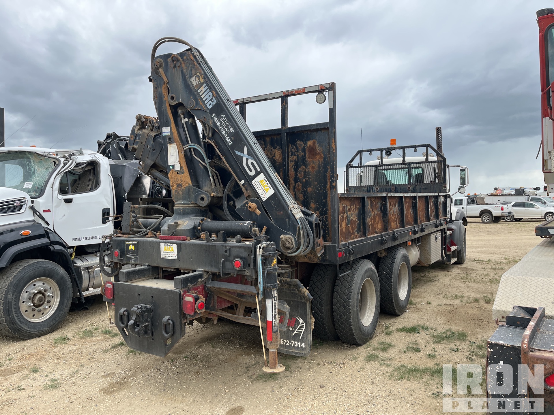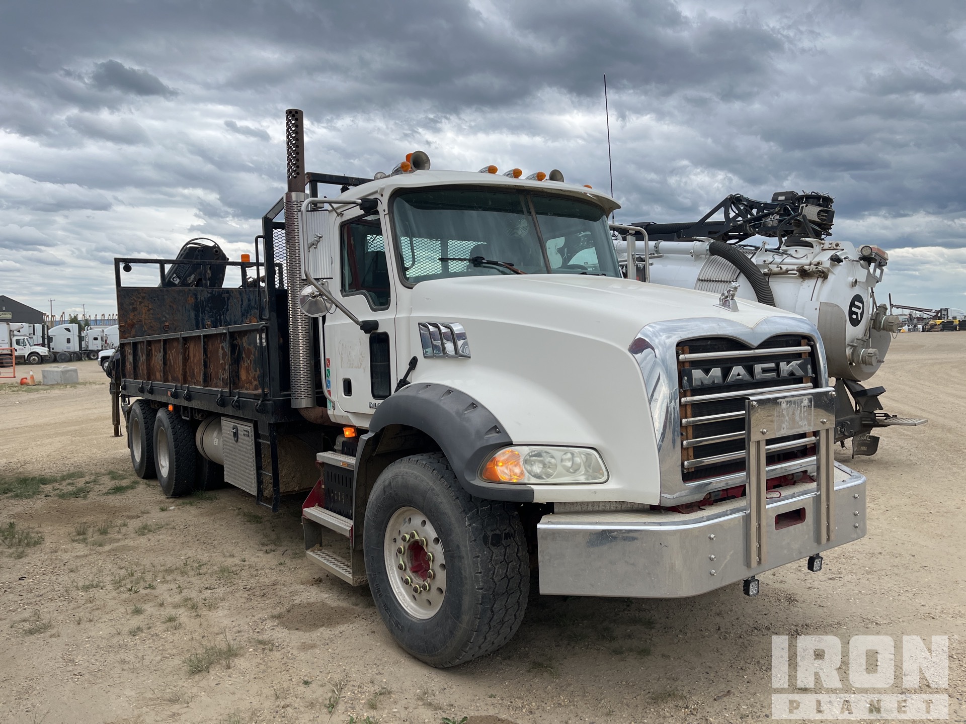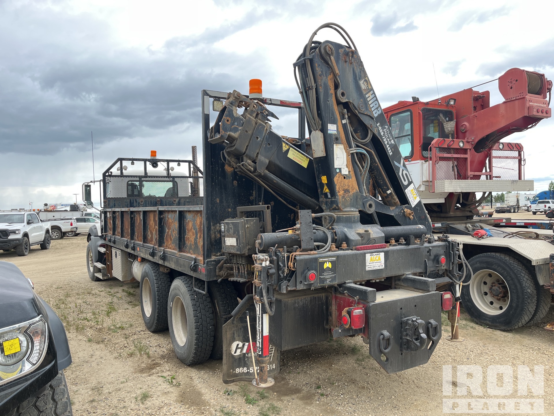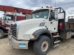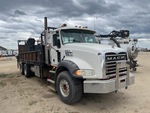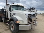 Mack MP8 6 Cylinder 12.8 L Diesel 338 hp Engine, 2008 US EPA Label, 5167 Engine hrs, Engine Brake, Eaton Fuller 18-Speed Manual Transmission, Differential Lock, 9100 kg Front Axle, 20800 kg Rears, 29900 kg GVWR, Air Ride Cab, Aluminum Wheels, 425/65R22.5 Front Tires, 11R22.5 Rear Tires, Dual Steering Boxes, Double Frame, Walking Beam Suspension, 255 in Wheelbase, PTO, Rear Mounted, 2 m - 10.6 m 4 Section Boom, Dual Controls, Out and Down Outriggers, Rear Outriggers, Remote Control w/Cord, 20 ft x 96 in Bed, Pintle Hitch, Hi-Rail System
