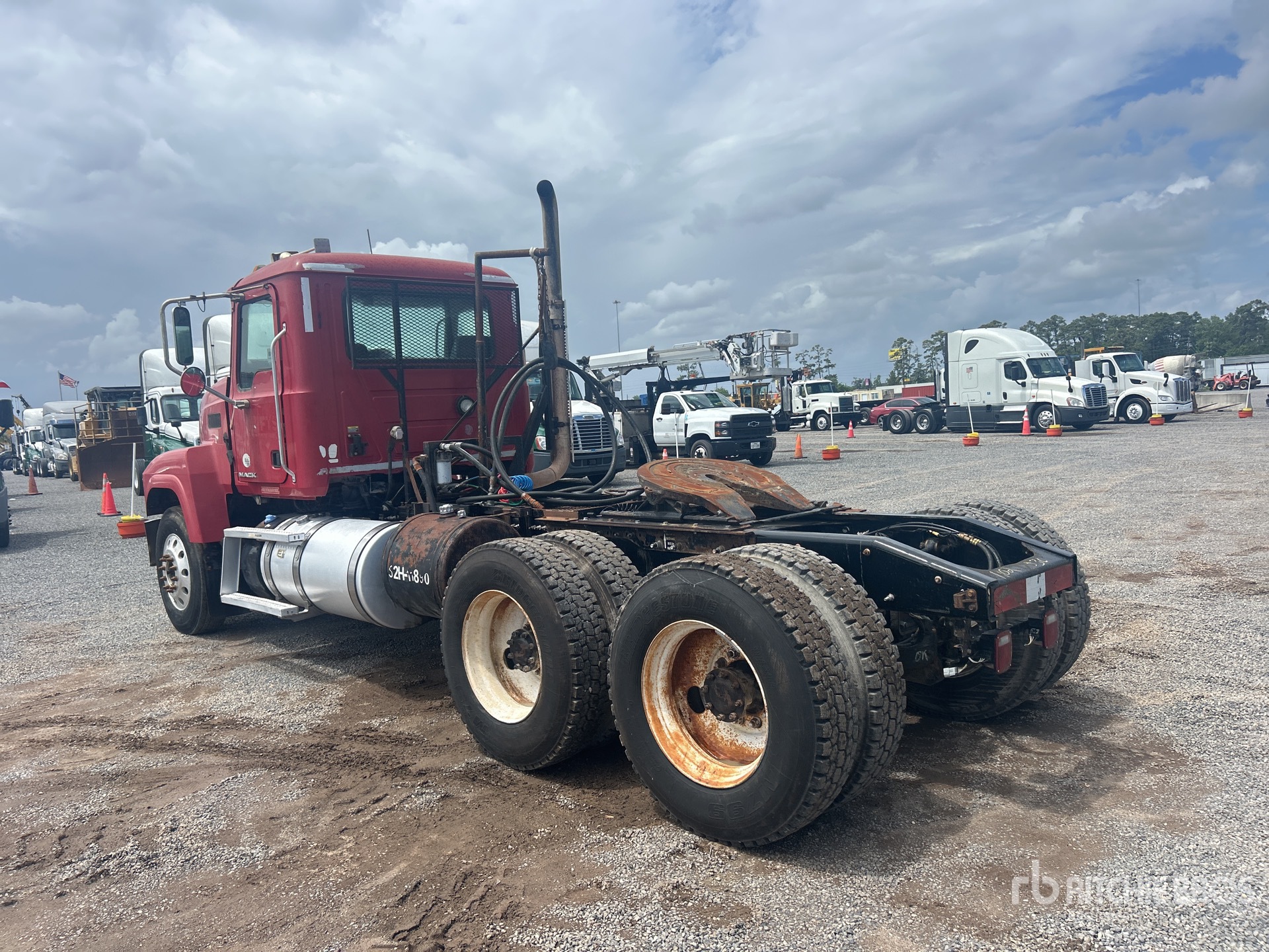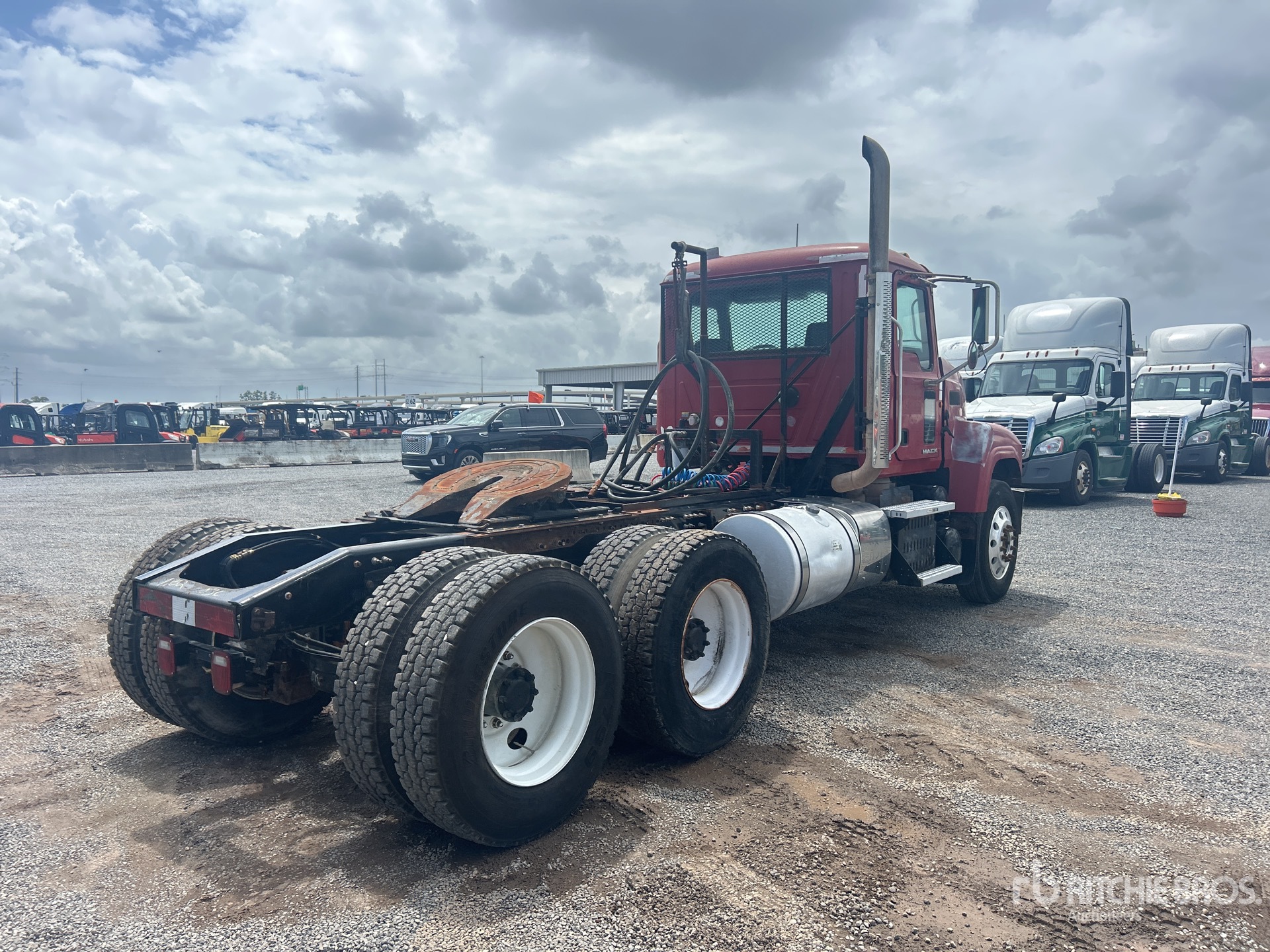 Located in Lane 31 Spot 34, Mack MP8 415 hp Engine, 2010 US EPA Label, Eaton Fuller 13-Speed Manual Transmission, 14320 lb Front Axle, 44000 lb Rears, 58320 lb GVWR, Engine Brake, 208 in Wheelbase, Camelback, Aluminum Front Wheels, 11R24.5, Wet Kit, Air Sliding 5th Wheel, Dual Fuel Tanks, Headache Rack, Mack MP8 w/Jakes, 13 spd, Eaton Fuller, 44,000 lb Camelback susp