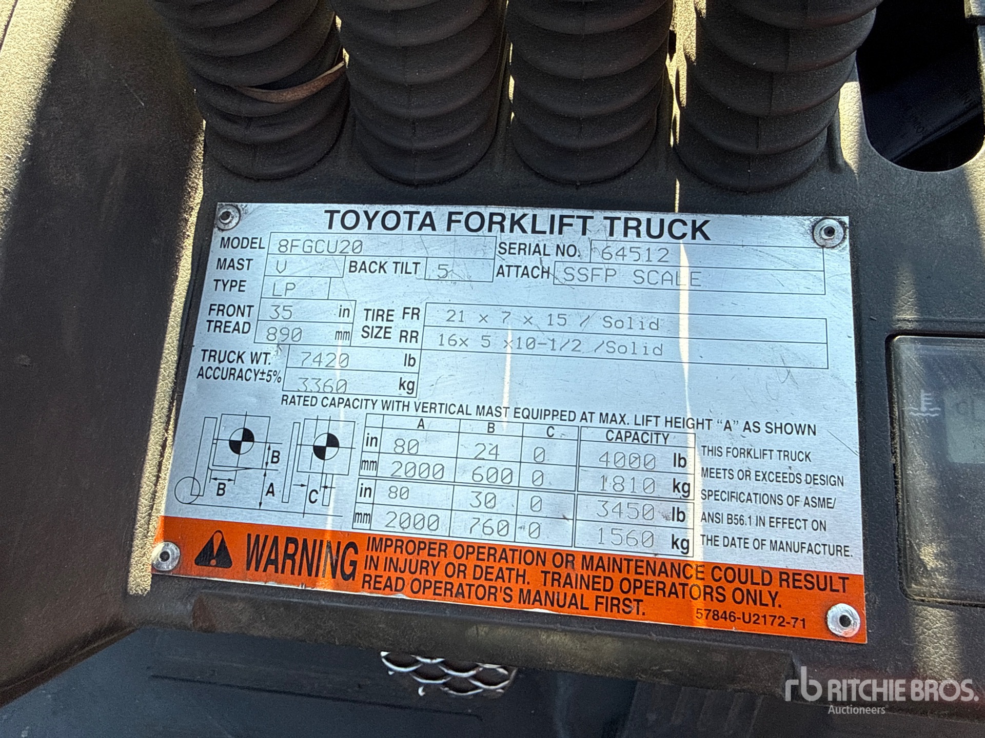 2 Stage Mast, 80 in Max Lift Height, 57 in Lowered Mast Height, 41 in Forks, Side Shift, Fork Positioner, Load Weigh System, 2014 US EPA Label, Toyota 4Y ECS 4 Cylinder 2.2 L LPG Engine