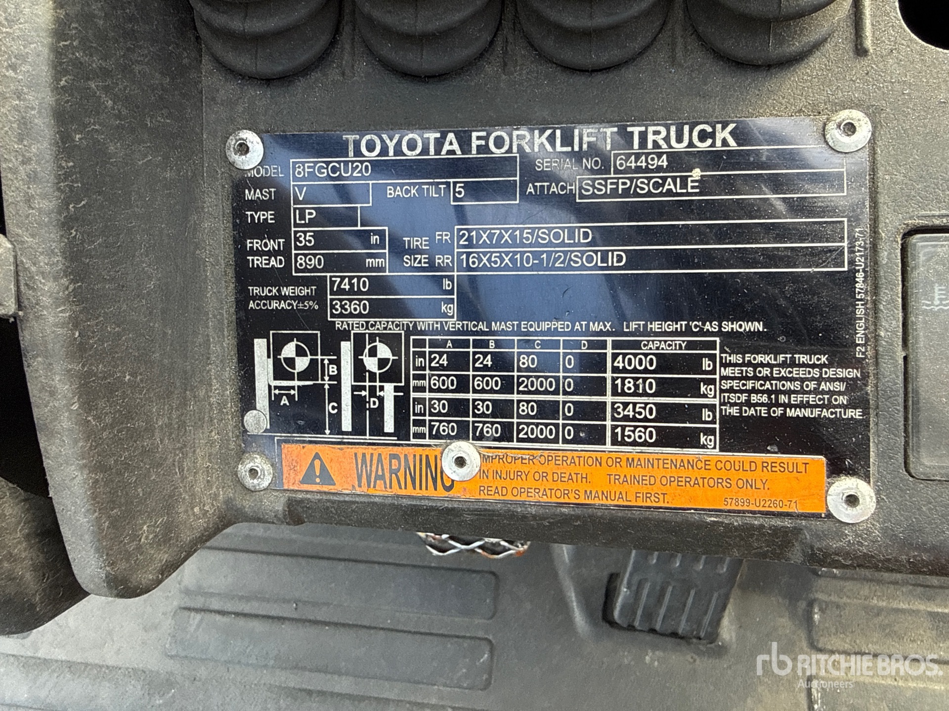 2 Stage Mast, 80 in Max Lift Height, 57 in Lowered Mast Height, 41 in Forks, Side Shift, Fork Positioner, Load Weigh System, 2014 US EPA Label, Toyota 4Y ECS 4 Cylinder 2.2 L LPG Engine