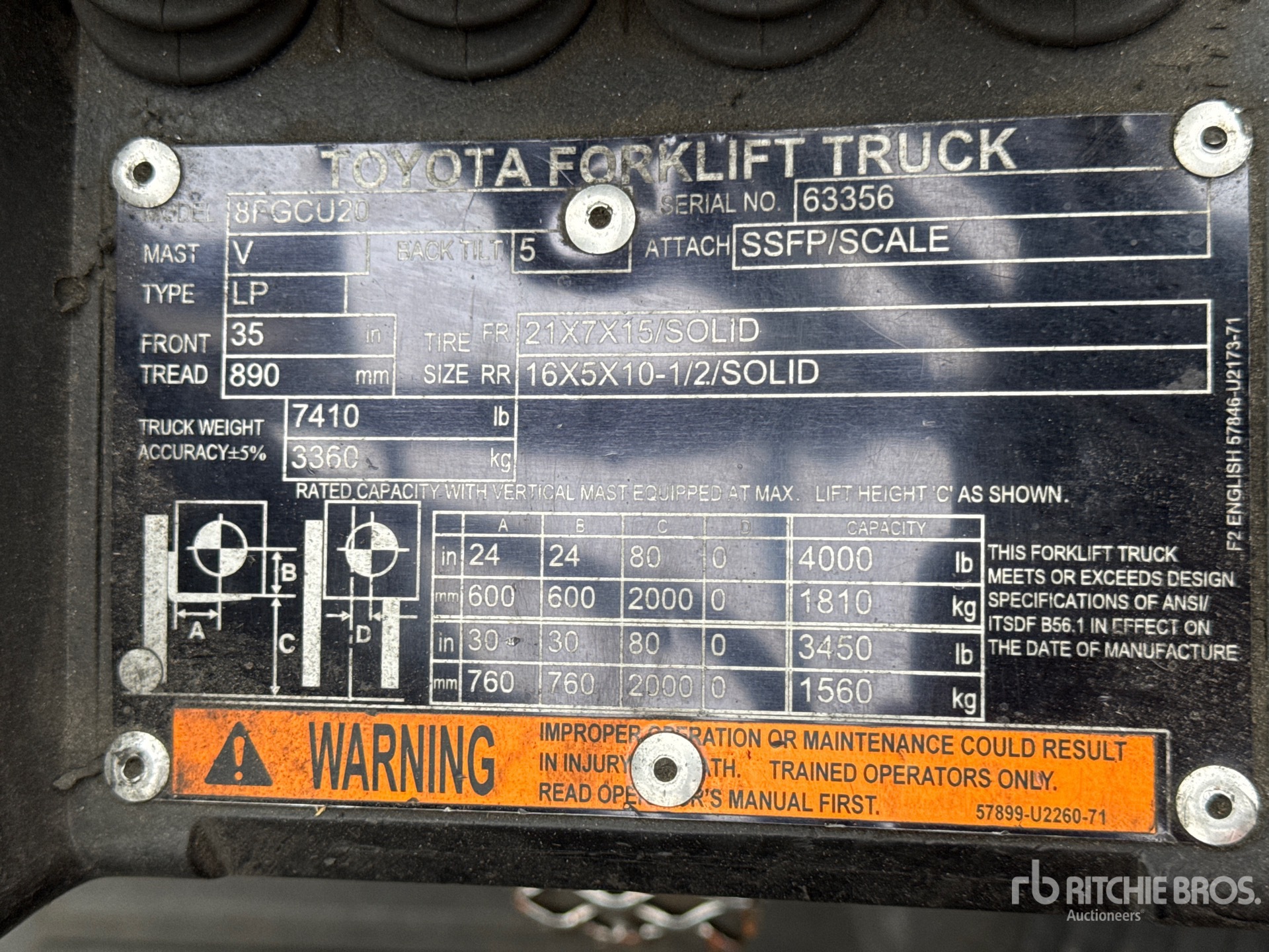 2 Stage Mast, 80 in Max Lift Height, 57 in Lowered Mast Height, 42 in Forks, Side Shift, Fork Positioner, Load Weigh System, 2014 US EPA Label, Toyota 4Y ECS 4 Cylinder 2.2 L LPG Engine