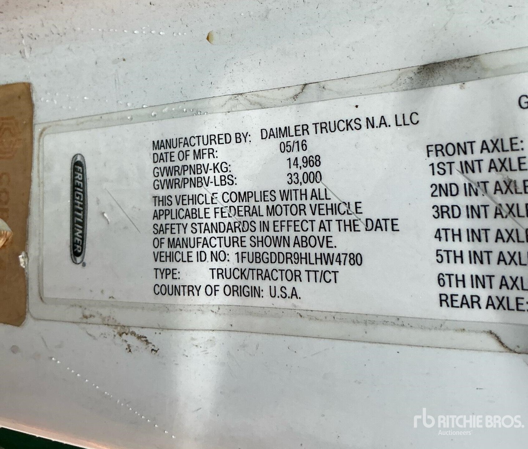 Detroit DD15 455 hp Engine, 2016 US EPA Label, 20951 Engine hrs, Eaton Fuller FRO-15210C 10-Speed Manual Transmission, 12000 lb Front Axle, 21000 lb Rears, 33000 lb GVWR, Engine Brake, 158 in Wheelbase, Air Suspension, 11R22.5, Dual Fuel Tanks