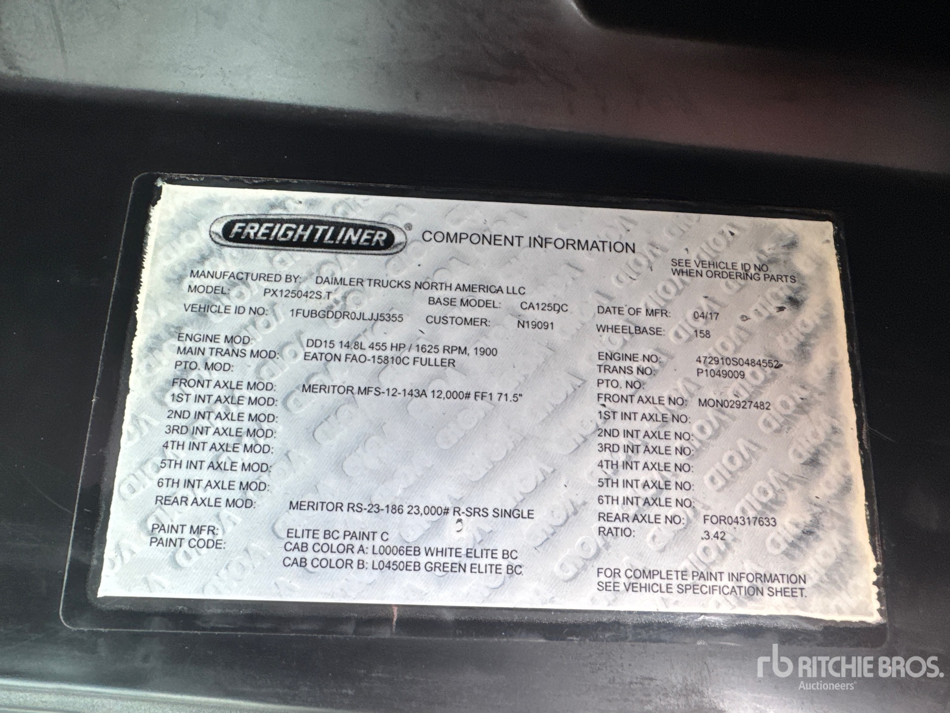 Located in Lane 32 Spot 21, Detroit DD15 455 hp Engine, US EPA Label, Eaton Fuller 10-Speed Manual Transmission, 12000 lb Front Axle, 23000 lb Rears, 158 in Wheelbase, Air Suspension, 11R22.5, Ballrace 5th Wheel, Dual Fuel Tanks