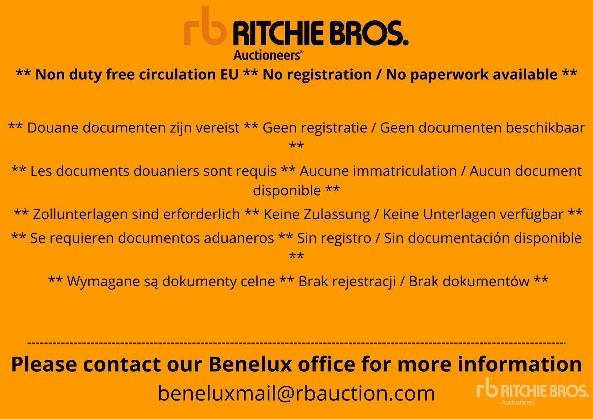 The detailed equipment information is limited in scope, and Ritchie Bros. Auctioneers has not inspected any aspects or components of the equipment other than those expressly set forth herein. Unless expressly stated, we make no representations or warranties, express or implied, concerning the equipment or its components, including without limitation any representations or warranties concerning functionality, conformity or compliance with any safety standard or requirement of any applicable authority or regulatory body, fitness for any particular purpose, or merchantability. You are strongly advised to perform your own detailed inspection of the equipment prior to bidding.