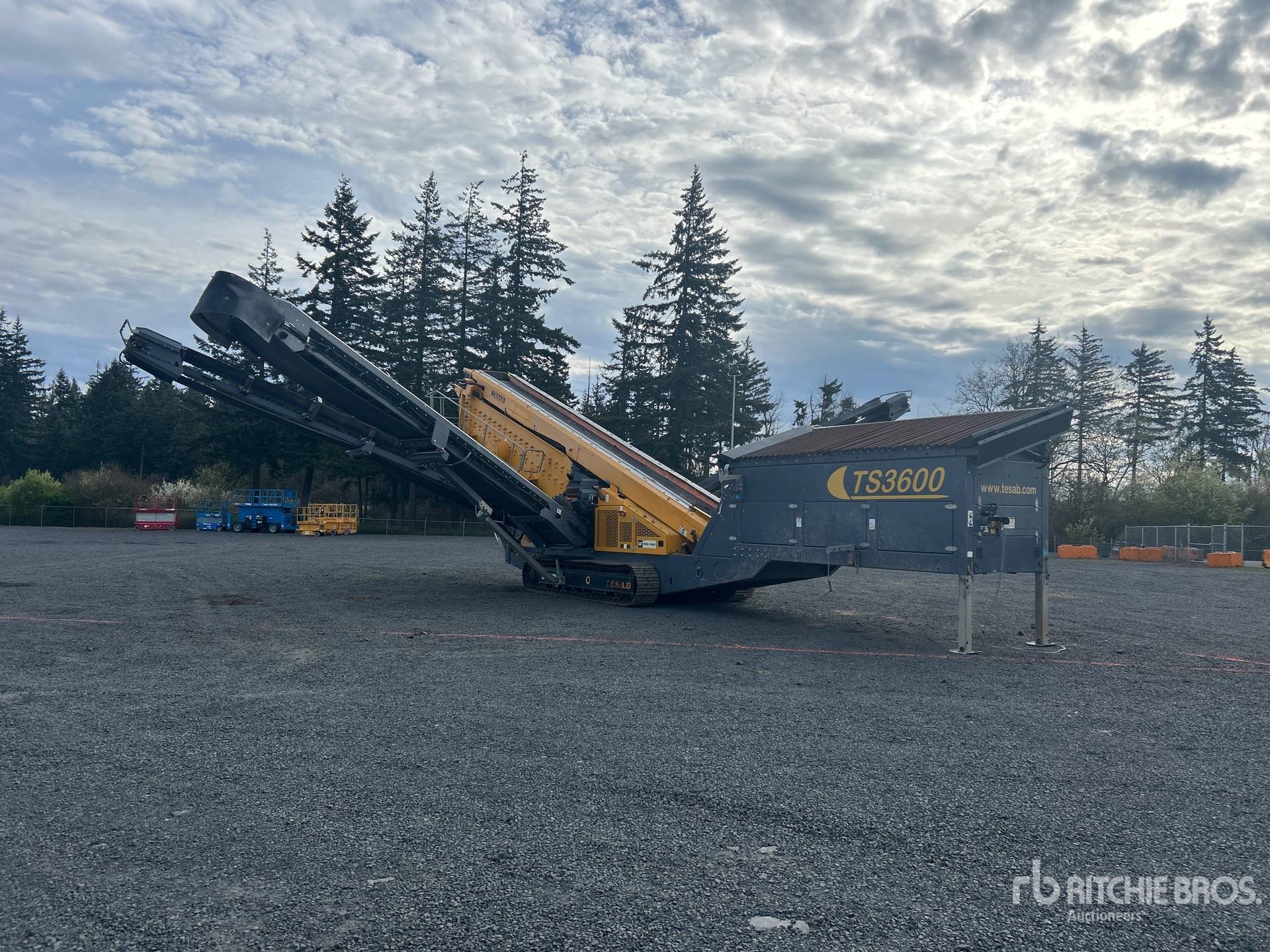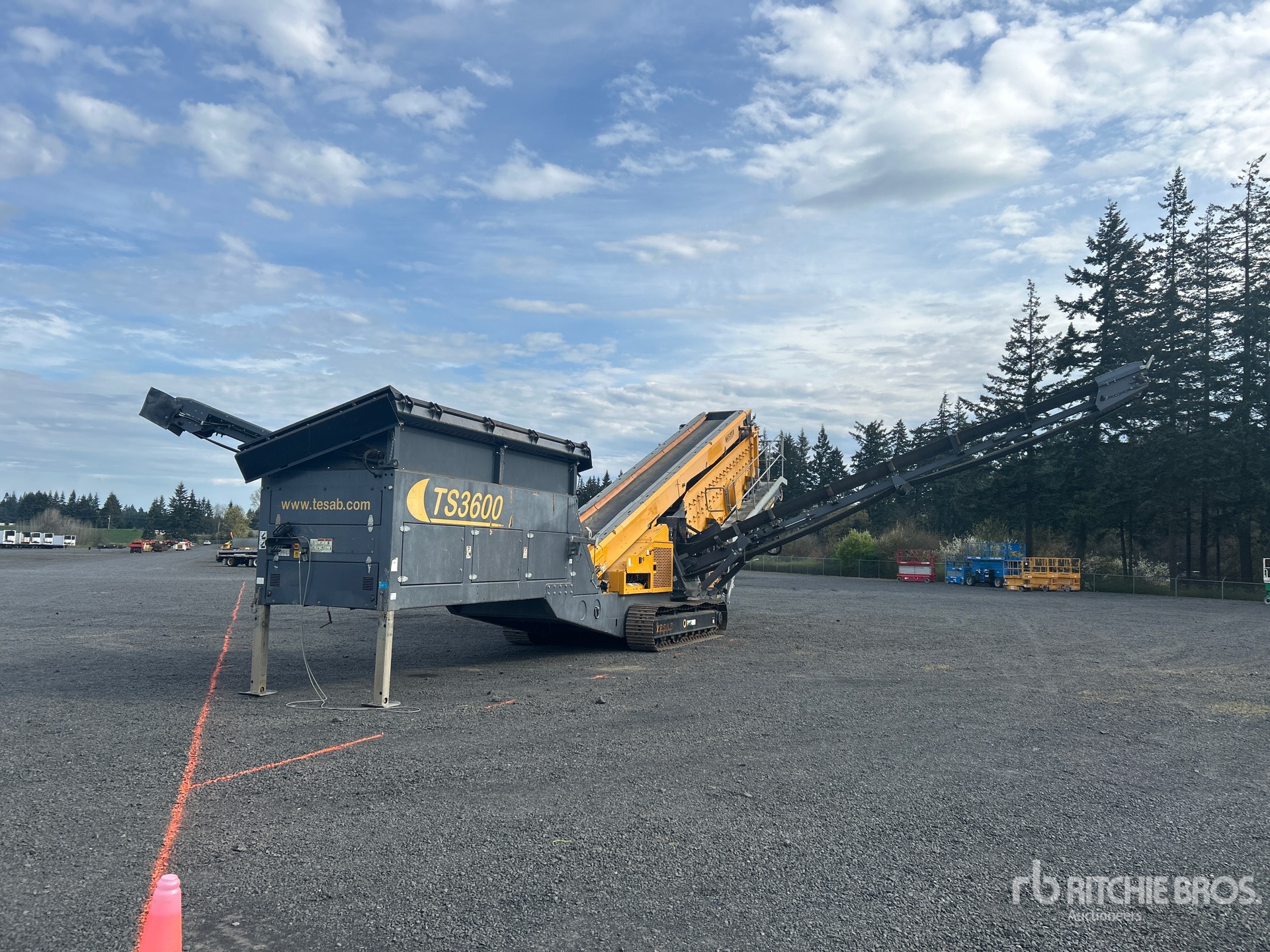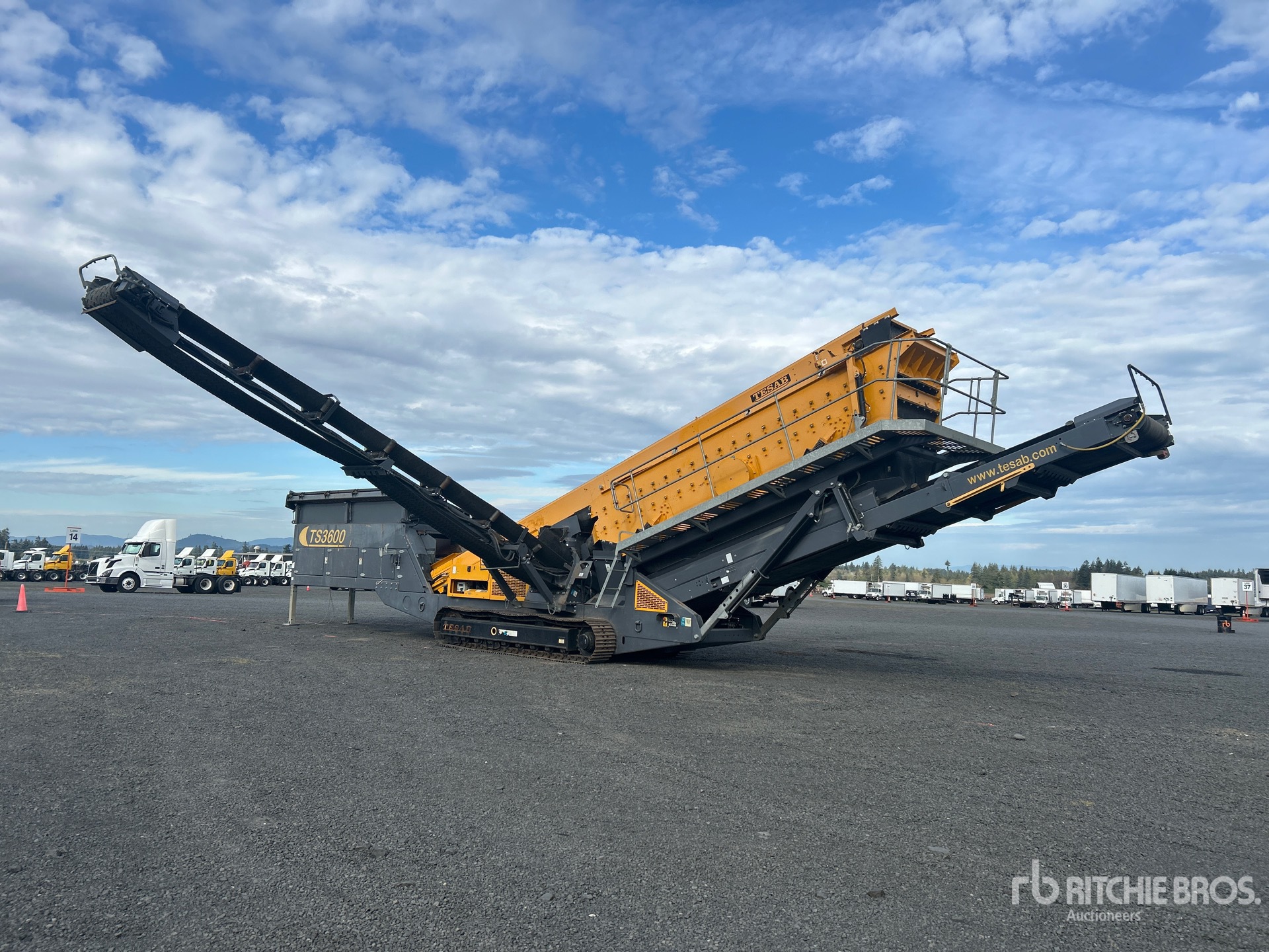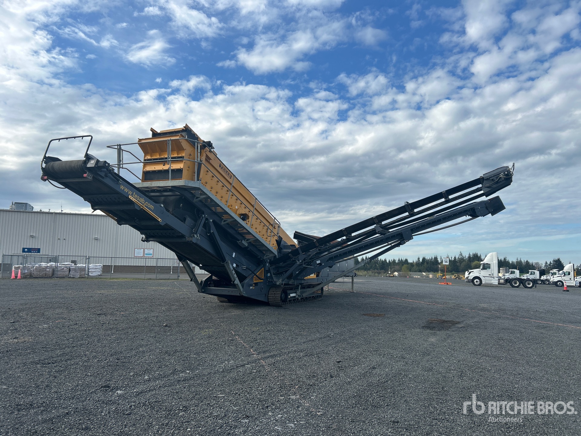 Tesab 5 ft 6 in x 15 ft Belt Feeder w/Grizzly 20 ft x 5 ft Triple Deck Screen, 29 in Wide Feed Conveyor, 46 in Wide Fines Discharge Conveyor, 40 in Wide Under Screen Conveyor, 25 in Wide Left Discharge Conveyor, 30 in Wide Right Discharge Conveyor, Radio and Cable Remote Control, 2020 US EPA Label, Cat C4.4 4 Cylinder 130 kW 4.4 L Diesel Engine, Requires Diesel Exhaust Fluid, Hydraulic Leveling, 19.5 in Triple Grouser Track Shoes