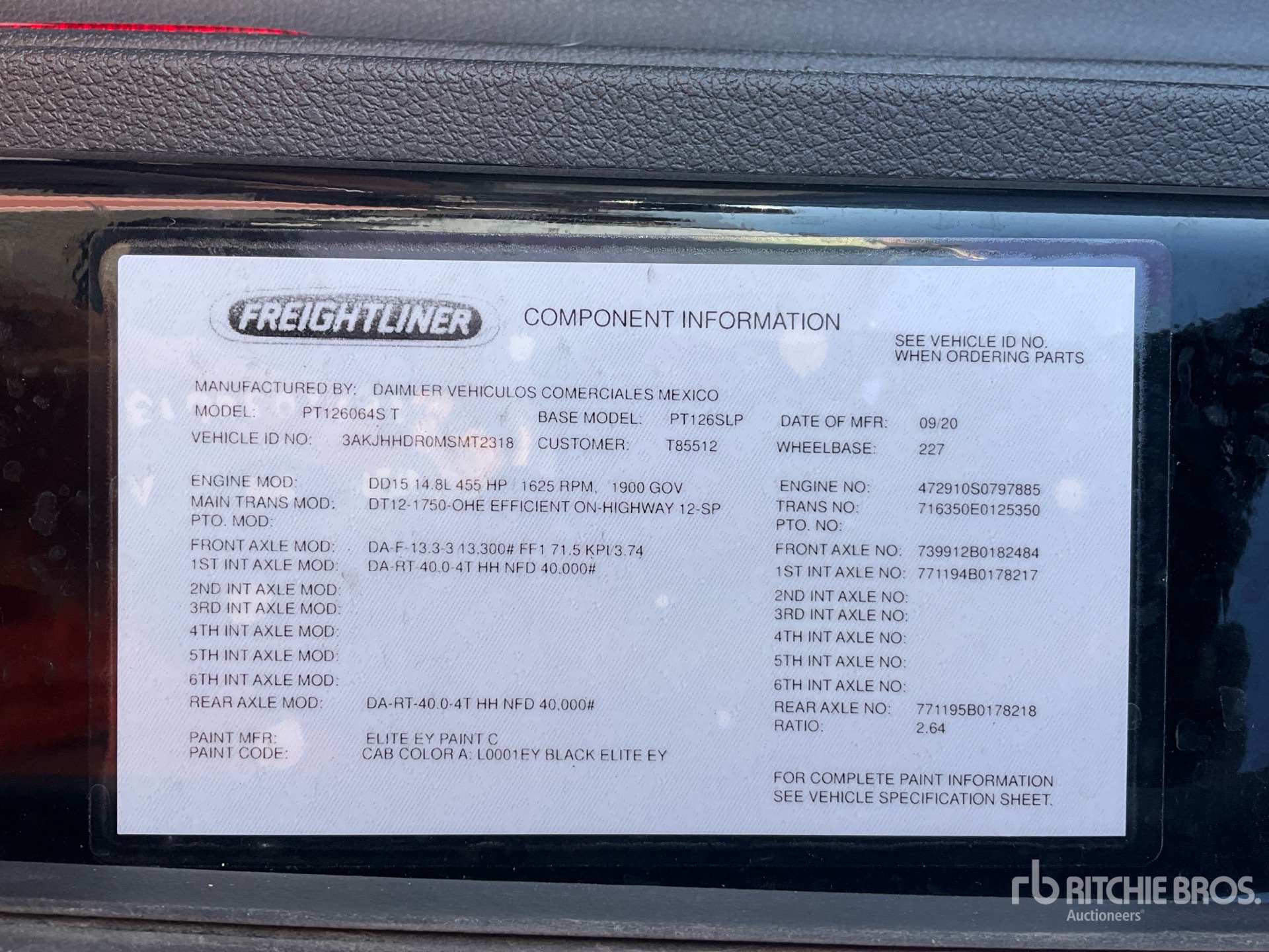 Located in Lane 3 Spot 5, Detroit DD15 455 hp Engine, 2020 US EPA Label, 21869.15 Engine hrs, Detroit DT12-1750-OHE 12-Speed Automated Transmission, 13300 lb Front Axle, 40000 lb Rears, 53300 lb GVWR, Engine Brake, 72 in High Rise Sleeper Cab, 227 in Wheelbase, Air Suspension, Aluminum Wheels, 295/75R22.5 Front Tires, 275/80R22.5 Rear Tires, Air Sliding 5th Wheel, Dual Fuel Tanks