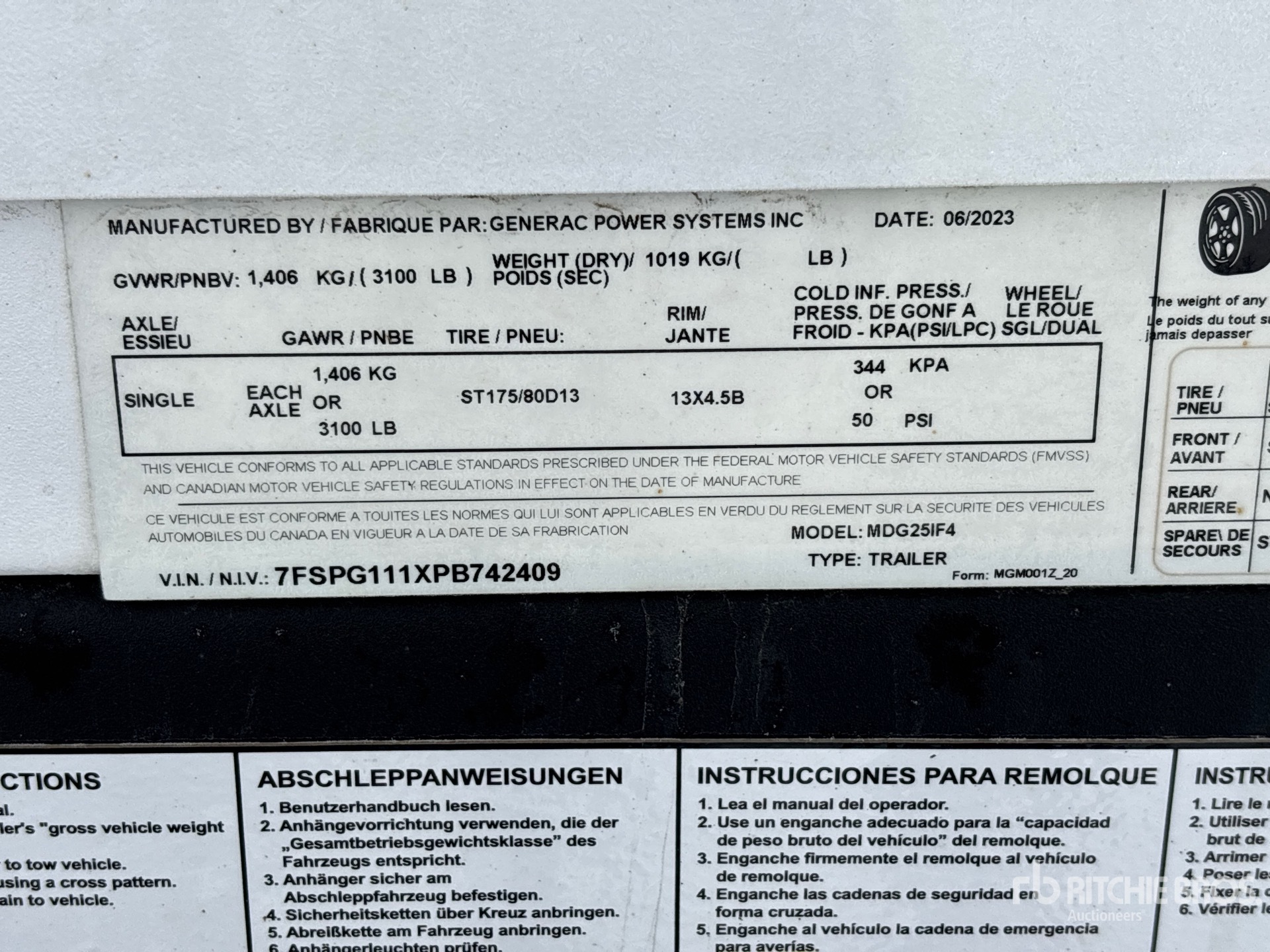 2023 US EPA Label, Isuzu BZ-4LE2T 4 Cylinder 30 kW 2.2 L Diesel Engine, 25 kVA/20 kW Rated 3 Phase Output, 480 V / 208 V / 240 V Rated Voltage, 17.5 kVA,/17.5 kW, Rated Single Phase Output, 240 V Rated Voltage, Sound Attenuated, Bottom Mounted Fuel Tank, Lunette Ring Carrier Trailer