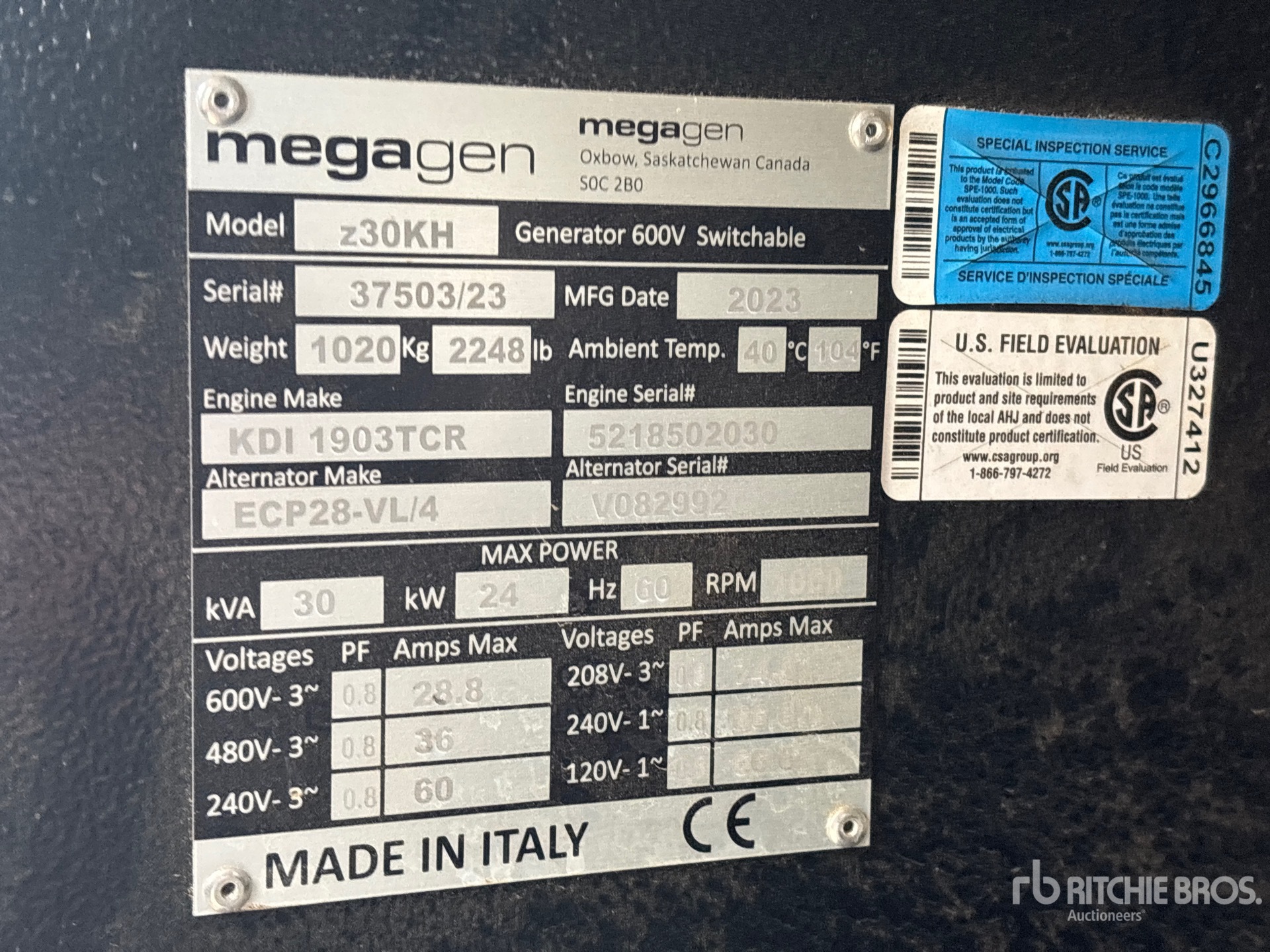 2022 US EPA Label, CARB Compliant, Kohler 3 Cylinder Diesel Engine, 30 kVA/24 kW Rated 3 Phase Output, 600 V / 480 V / 240 V Rated Voltage, 240 V / 120 V Rated Voltage, 240 V & 120 V Receptacles, Bottom Mounted Fuel Tank