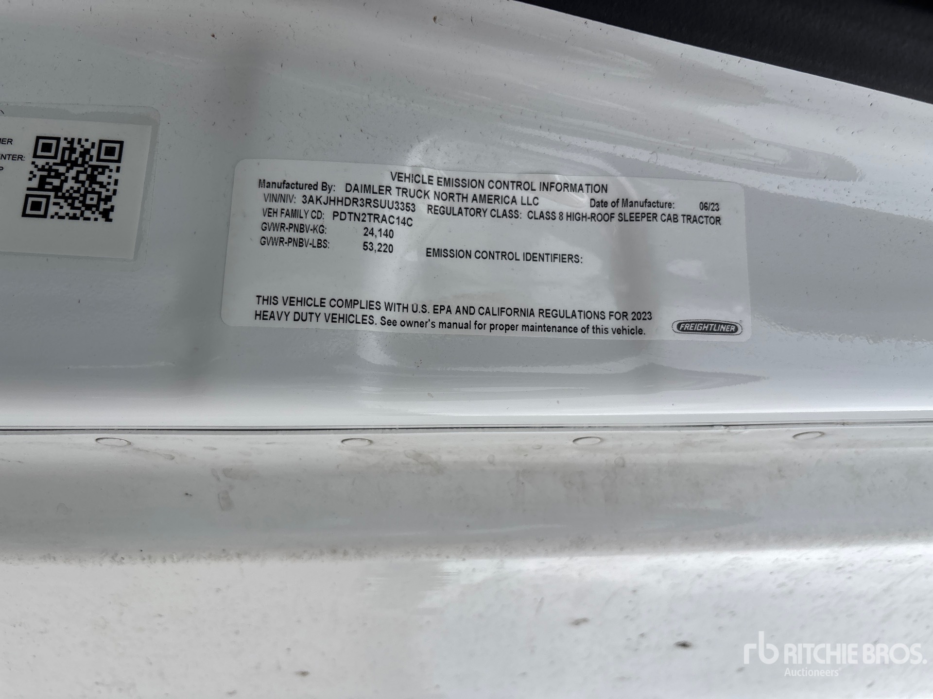 Detroit DD15 505 hp Engine, 2023 US EPA Label, Detroit DT12-1650-OHE 12-Speed Automated Transmission, 13220 lb Front Axle, 40000 lb Rears, 53220 lb GVWR, Engine Brake, Double Differential Locks, High Rise Sleeper Cab, Bunk Beds, Air Suspension, Aluminum Wheels, 11R22.5, Air Sliding 5th Wheel, Dual Fuel Tanks