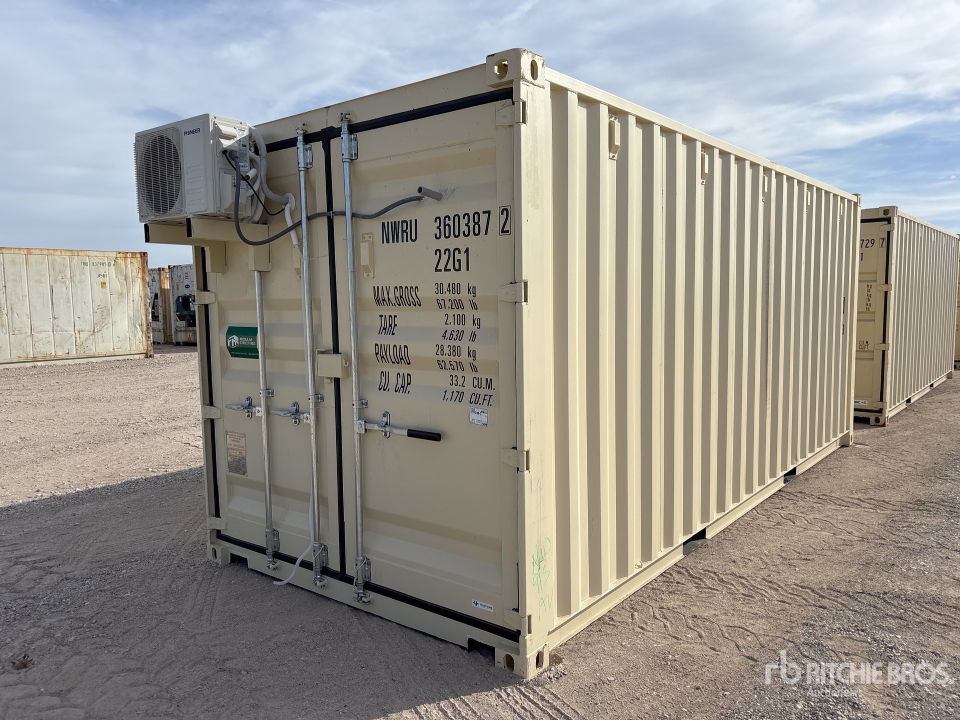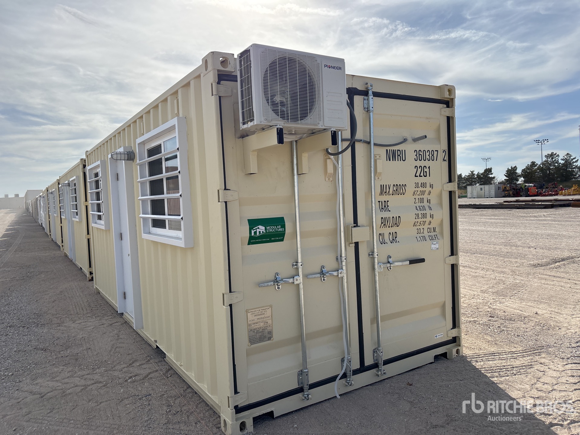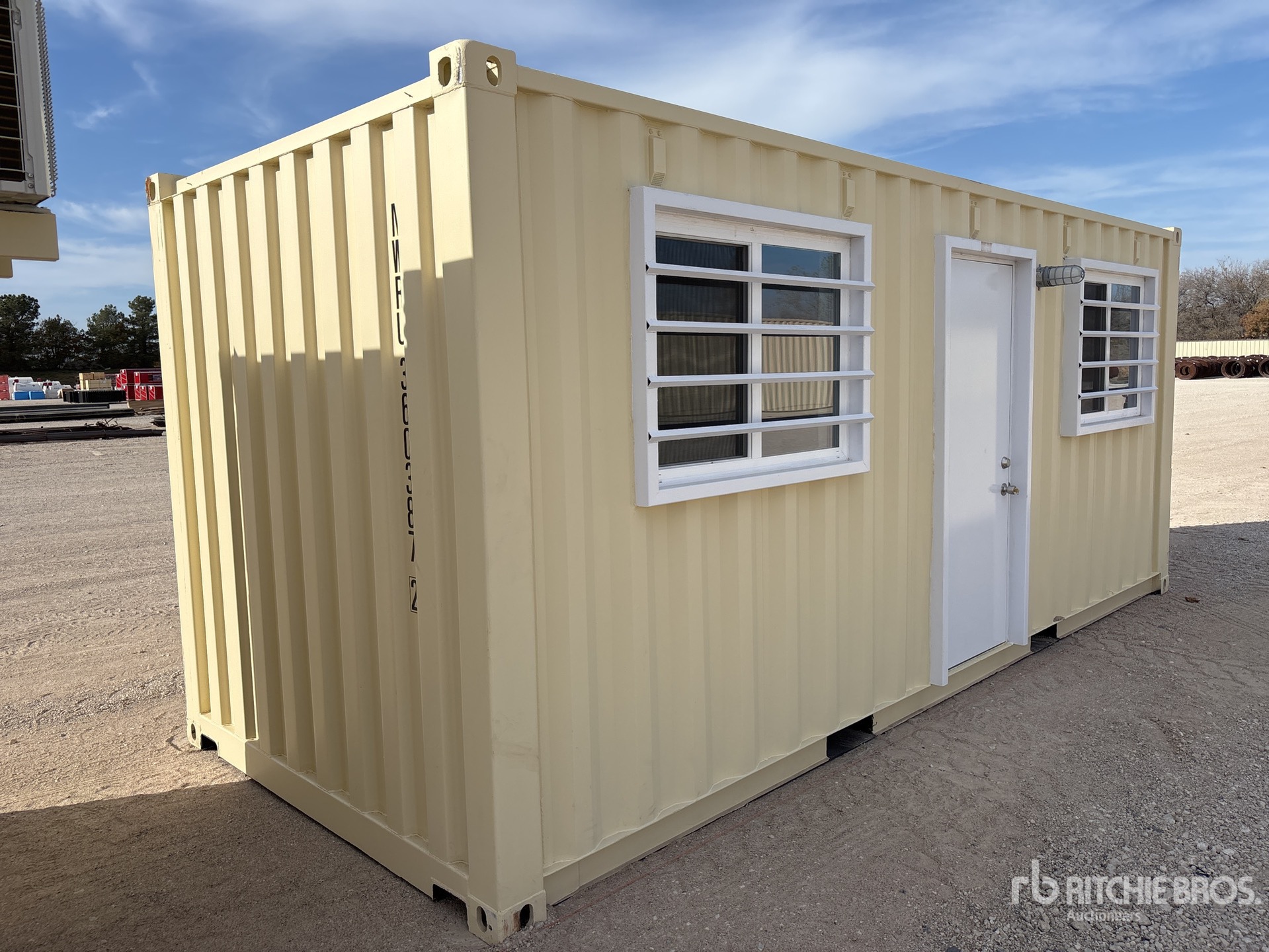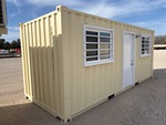 20 ft x 8 ft Office, 20' x 8', 8' 6" High, (1) Swing-Out Door, (2) Windows w/Security Bars, Fork Pockets, Laminate Flooring, SunScreen, R13 Insulation, (1) Pioneer HVAC Mini-Split, (1) Electric Panel, LED Ceiling Lights, Interior Outlets, Wiring done to National Electric Code (NEC)