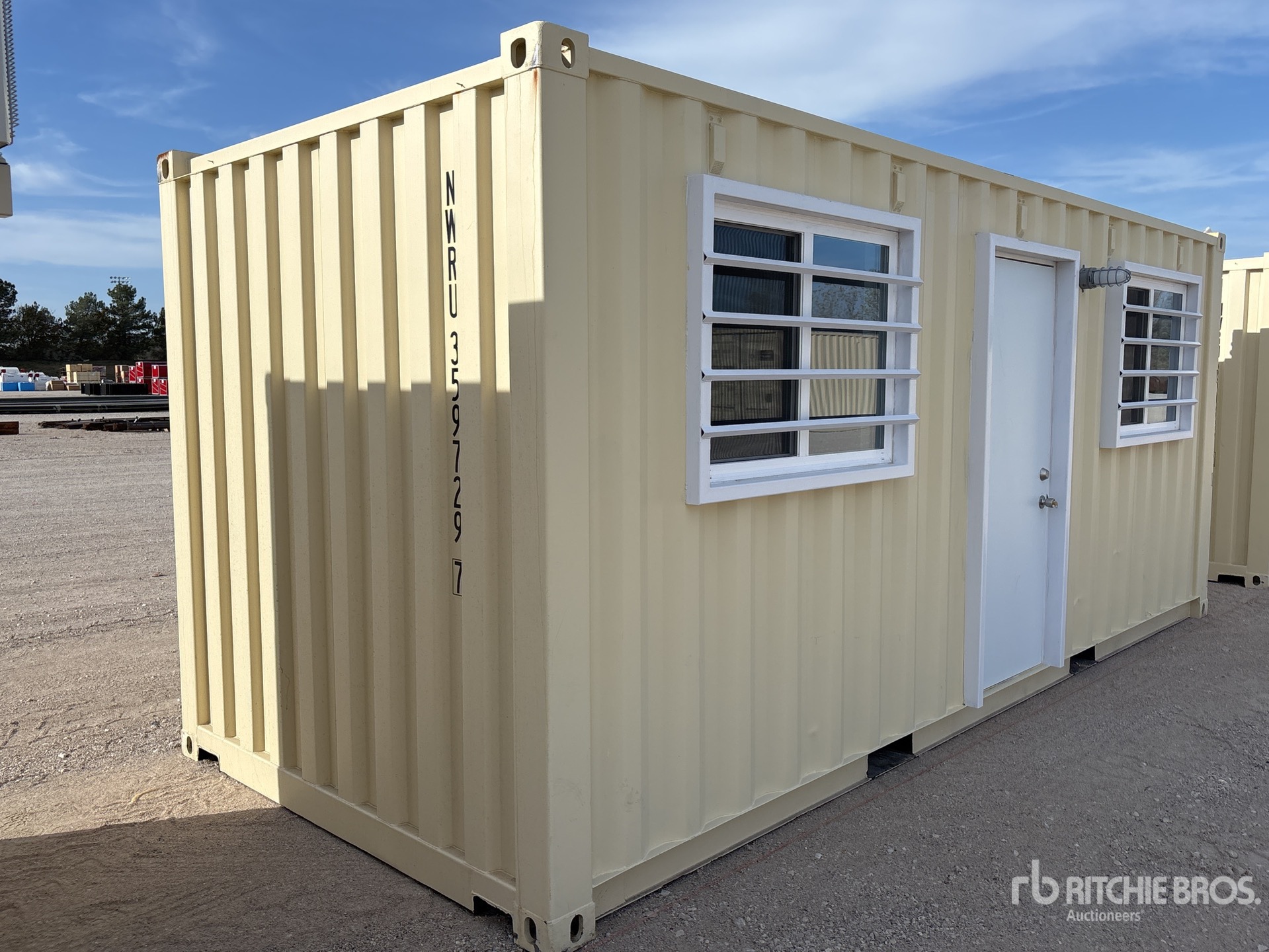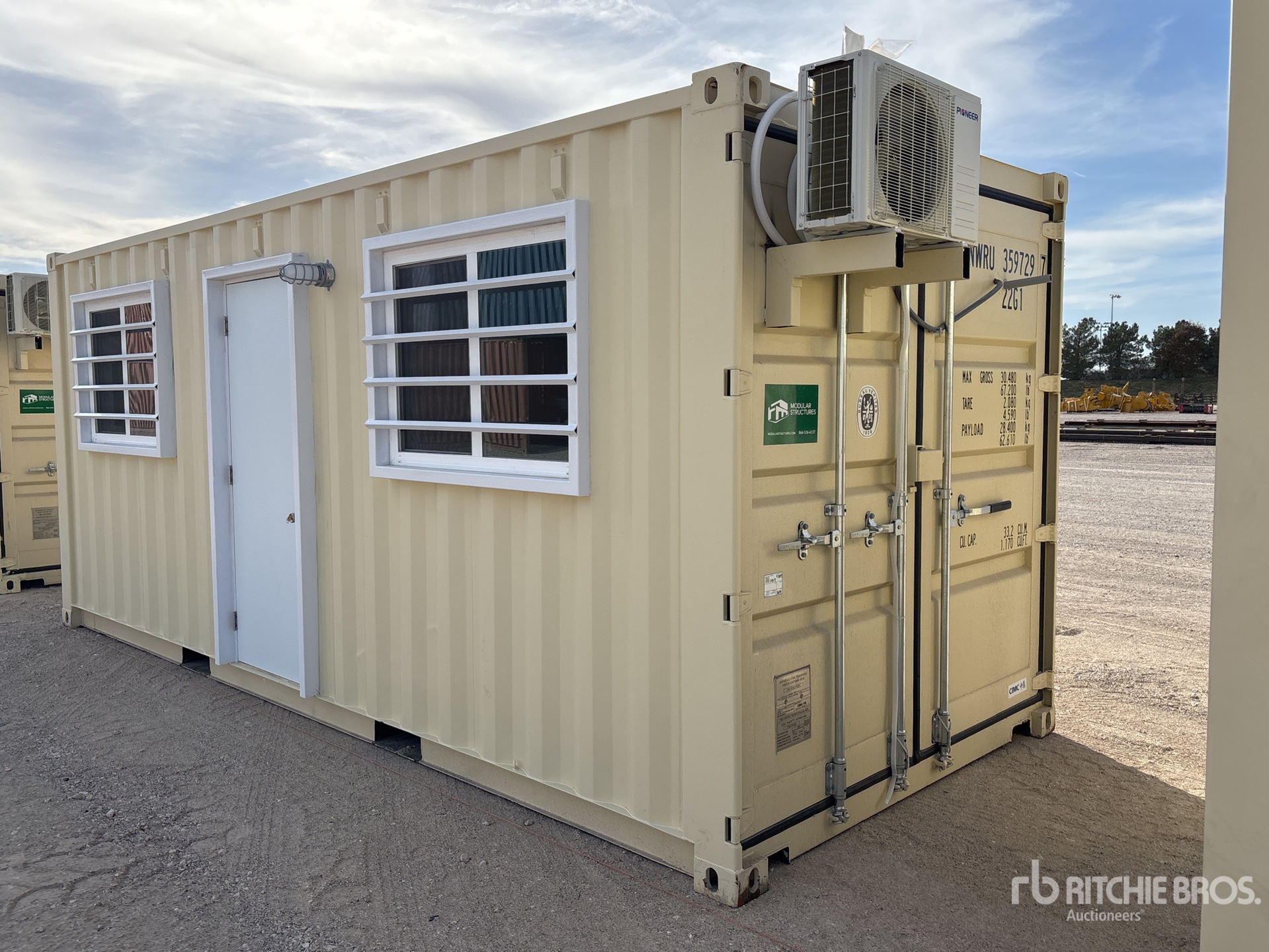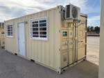 20 ft x 8 ft Office, 20' x 8', 8' 6" High, (1) Swing-Out Door, (2) Windows w/Security Bars, Fork Pockets, Laminate Flooring, SunScreen, R13 Insulation, (1) Pioneer HVAC Mini-Split, (1) Electric Panel, LED Ceiling Lights, Interior Outlets, Wiring done to National Electric Code (NEC)