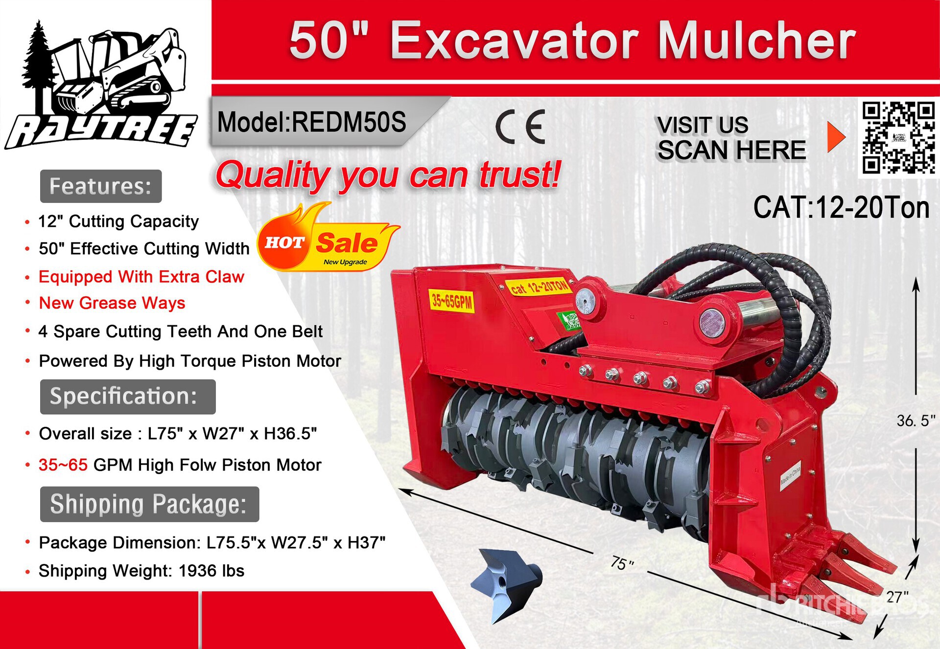 2026 Raytree REDM50S 50 in Excavator Mulcher - Fits Cat 12 - 20 ton (Unused)